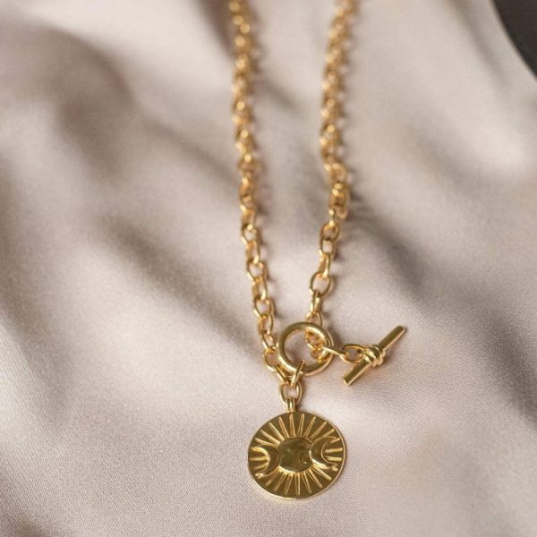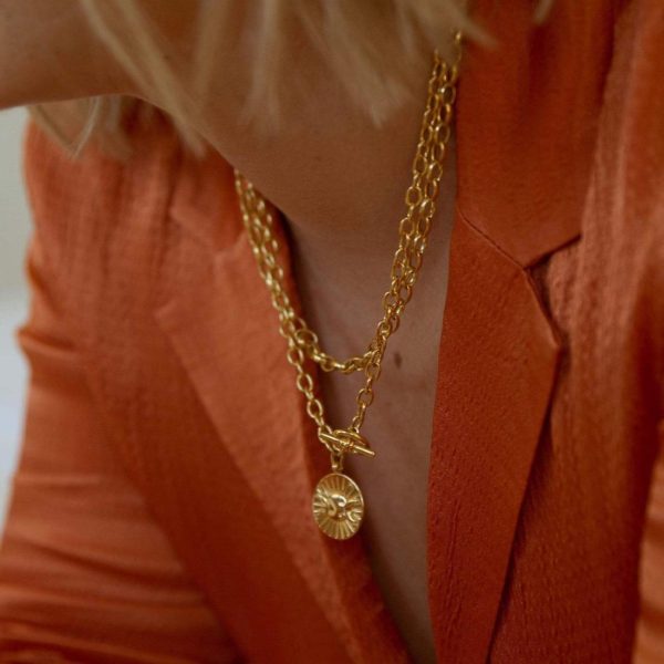 Our goddess spin on a cult classic, the Estee Lalonde Goddess Medallion T Bar Necklace is a statement piece with a nod to the past. Crafted in 18ct gold plated sterling silver, the necklace comes complete with a medallion style goddess pendant and T bar fastening.