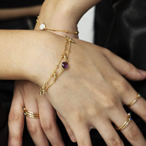 Get that good energy glow. Encouraging inner strength, this delicate purple stone is said to heighten concentration and boost motivation to achieve personal goals. Crafted in 18ct gold plated sterling silver featuring an open-backed Amethyst stone on a delicate bobble chain, the Amethyst Healing Stone Bobble bracelet will become your new go-to, because who can say no to a little bit of good energy?