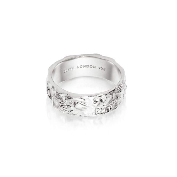 Are you ready for compliments? The Isla Fossil Band ring is a head turner and will be the new favourite in your jewellery box. Crafted in sterling silver, this chunky stacking ring features carved symbols of starfish, shells and stones throughout in a matt finish sterling silver.
